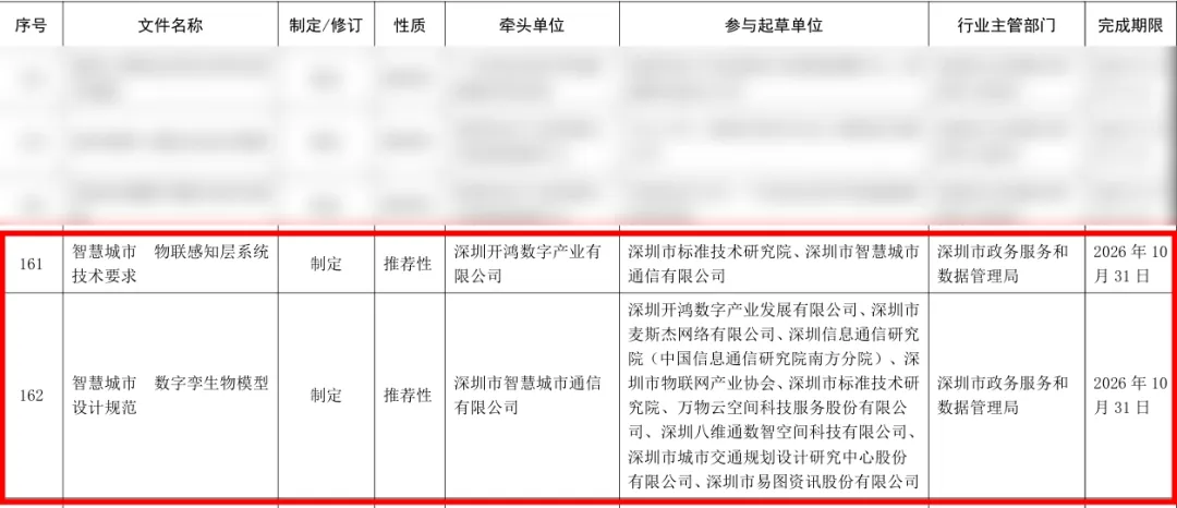 日前,深圳市市场监督管理局正式下达了《2025年深圳市地方标准计划项目任务的通知》。由深开鸿牵头主编的《智慧城市 物联感知层系统技术要求》以及参与编制的《智慧城市 数字孪生物模型设计规范》两项地方标准成功获批立项。这一突破标志着深开鸿在物联感知和数字孪生关键技术领域的研发实力与行业贡献获得权威认可,实现了从技术实践者到标准制定者的跨越,进一步巩固其在智慧城市赛道中的竞争优势。