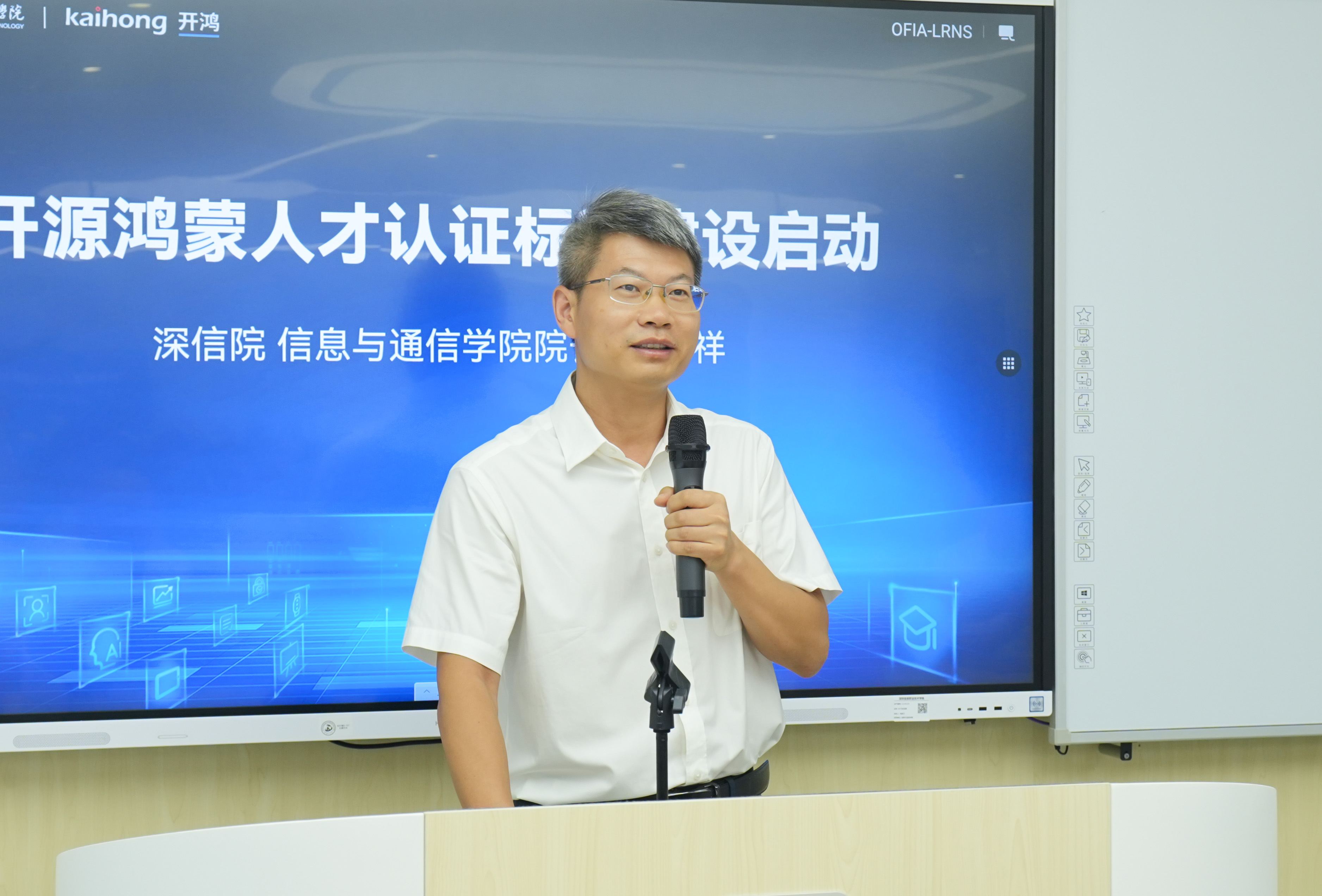 现场举办开源鸿蒙人才认证体系标准建设启动仪式,深信院信息与通信学院院长管明祥介绍到,本次标准建设主要围绕开源鸿蒙应用开发工程师认证、开源鸿蒙行业解决方案工程师认证,制定明确的人才认证体系和考核标准,帮助开源鸿蒙人才清晰专业学习发展规划,助力开源鸿蒙厂商选拔优秀人才。