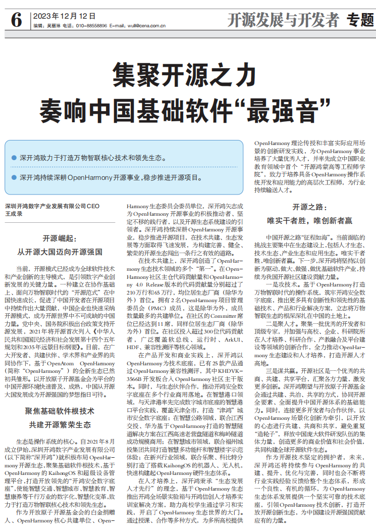 深开鸿CEO王成录受邀作此次专题报道,分享深开鸿在开源技术创新及社区共建方面的实践经验,为推动我国开源事业的发展贡献力量。