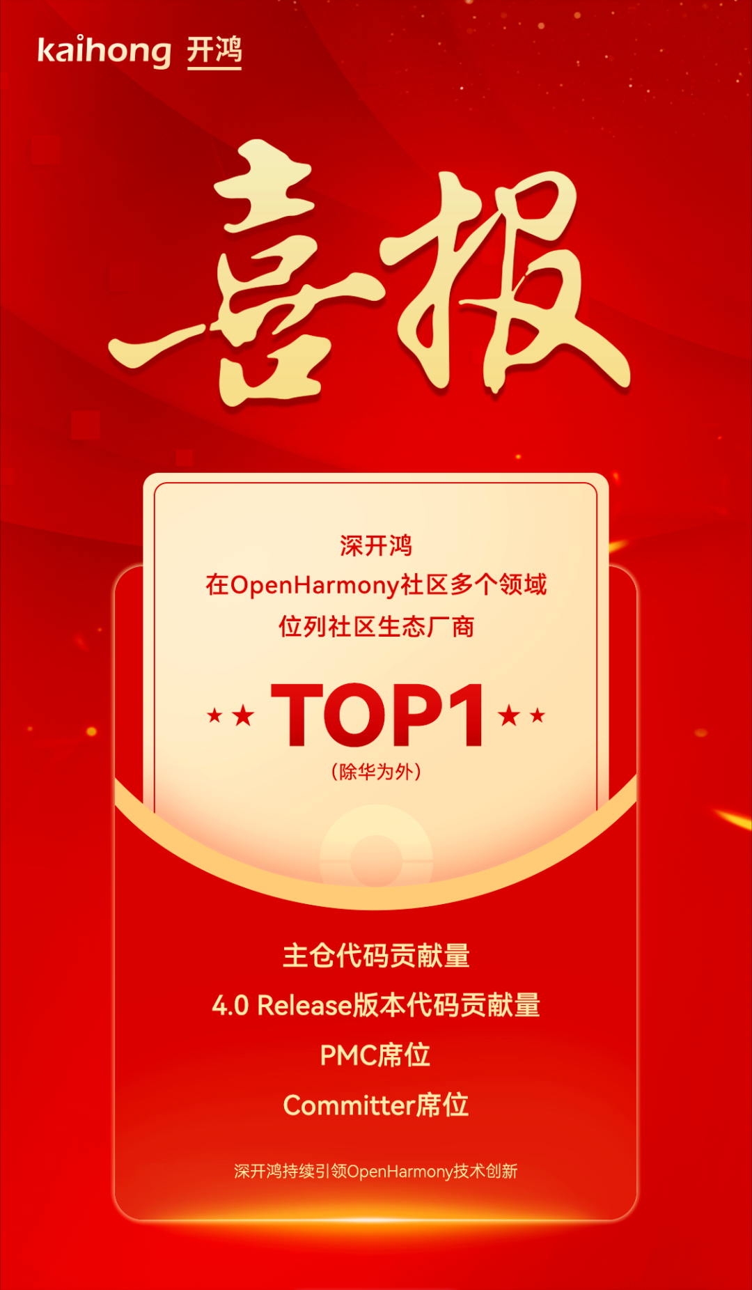 深开鸿在OpenHarmony社区多个领域位列社区生态厂商TOP1(除华为外)