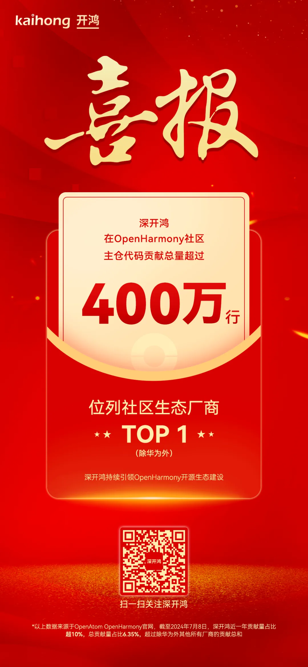 2024年7月8日,据OpenAtom OpenHarmony (以下简称“OpenHarmony”)官网显示,深开鸿在OpenHarmony社区主仓代码贡献总量超过400万行,在华为以外的生态厂商中位居第一。近一年内,深开鸿OpenHarmony主仓代码贡献量占比超过10%,远远超出除华为外其他所有厂商的贡献总和。
