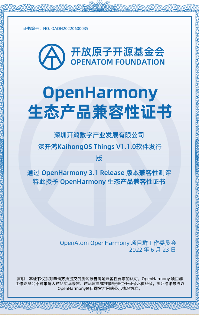 KaihongOS Things软件发行版OpenHarmony生态产品兼容性证书