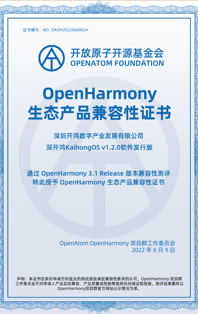 KaihongOS 软件发行版OpenHarmony生态产品兼容性证书
