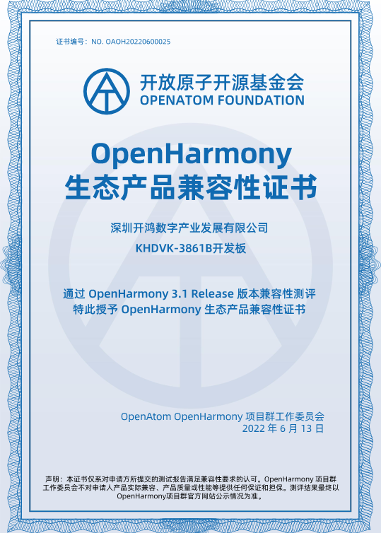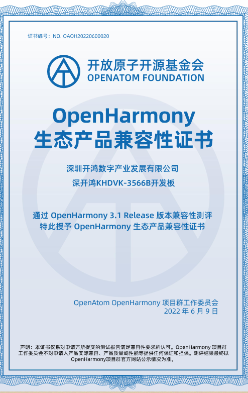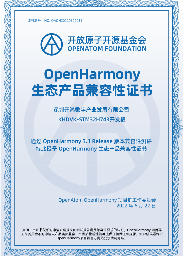 KHDVK-3568A、KHDVK-3566B、KHDVK-STM32H743、KHDVK-3861B、KHDVK-8910A 开发板OpenHarmony生态产品兼容性证书