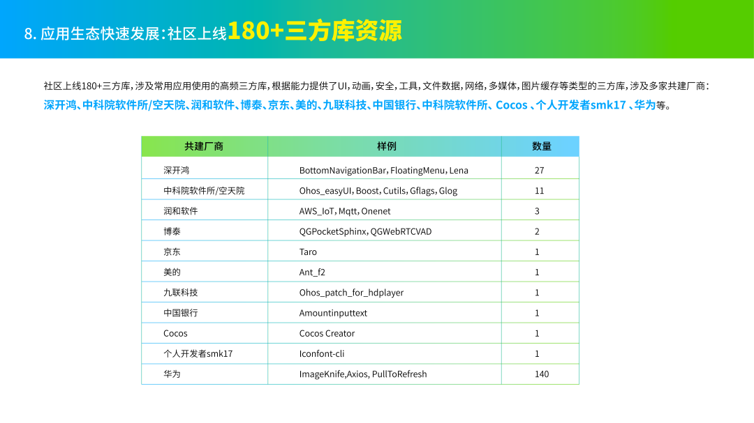 在应用生态层面,OpenHarmony社区共上线180+三方库资源,包括常用的高频三方库,满足开发者UI、动画、多媒体等方面能力的需求,其中深开鸿三方库资源上线达27个,位居共建单位前列。