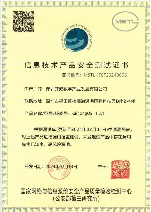 此次深开鸿国产操作系统“KaihongOS”获得《信息技术产品安全测试证书》是其在安全性方面取得的又一次重大突破,也是其进一步开拓市场的有力支撑。未来,深开鸿将持续投入关键核心技术KaihongOS的创新研发,不断提升其安全性和稳定性,为用户提供更加优质、高效的的软硬件产品及解决方案。同时,深开鸿也将积极与各行业合作伙伴开展深度合作,共同推动KaihongOS在更多领域的应用与发展,为推动行业数字化、智能化升级做出更大的贡献。