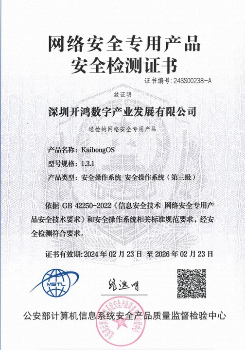 值得一提的是,KaihongOS此前经公安部计算机信息系统安全产品质量监督检验中心严格评审检测,符合《GB/T 20272-2019信息安全技术操作系统安全技术要求》的标准,成功通过安全操作系统评测认证,并获得《网络安全专用产品安全检测证书》。作为国家级技术检测标准,GB/T 20272-2019规定了国内操作系统安全等级的最高标准,同时也是最权威标准。