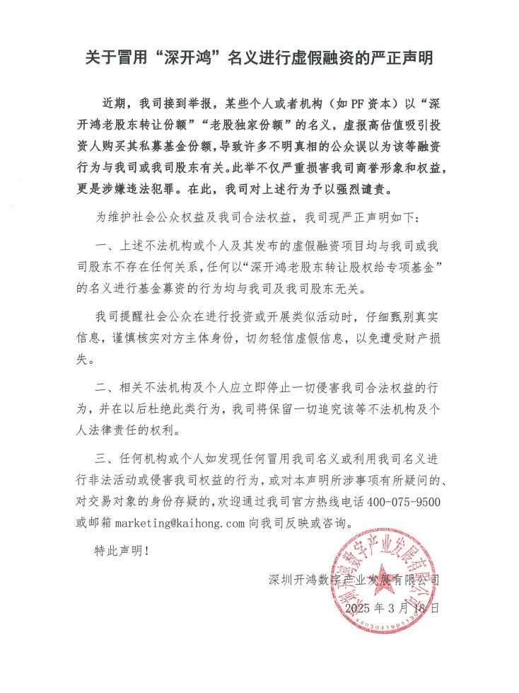 关于冒用“深开鸿”名义进行虚假融资的严正声明