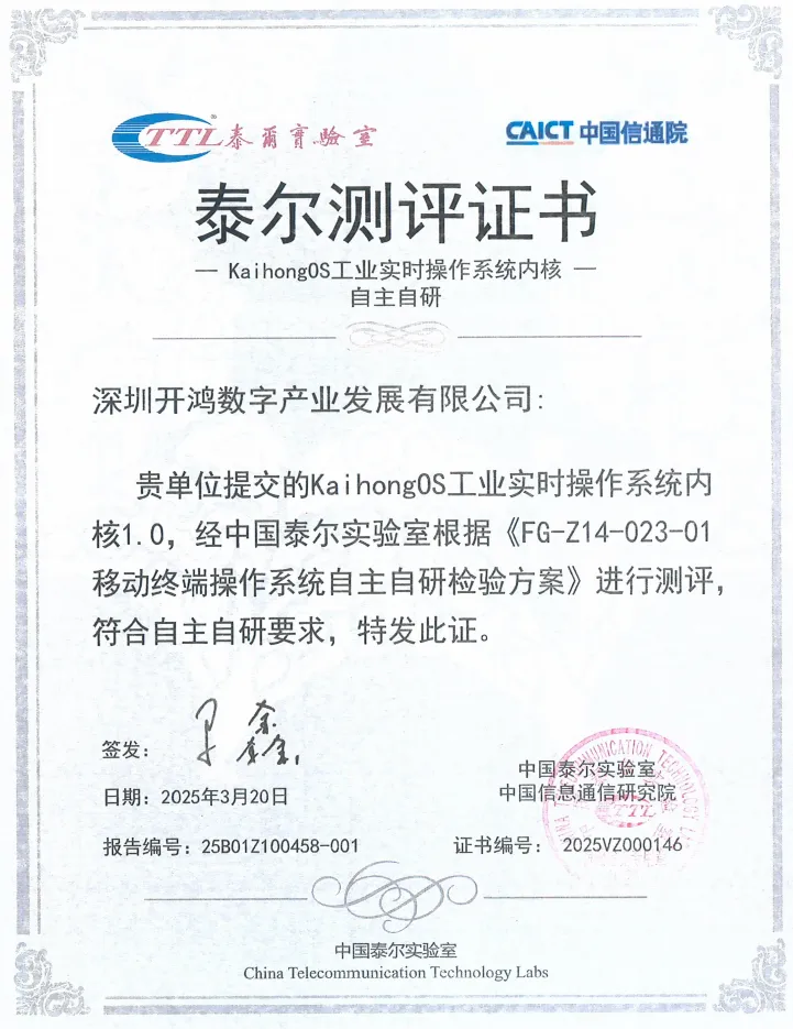 权威认证!KaihongOS工业实时操作系统内核通过中国泰尔实验室的测试认证
