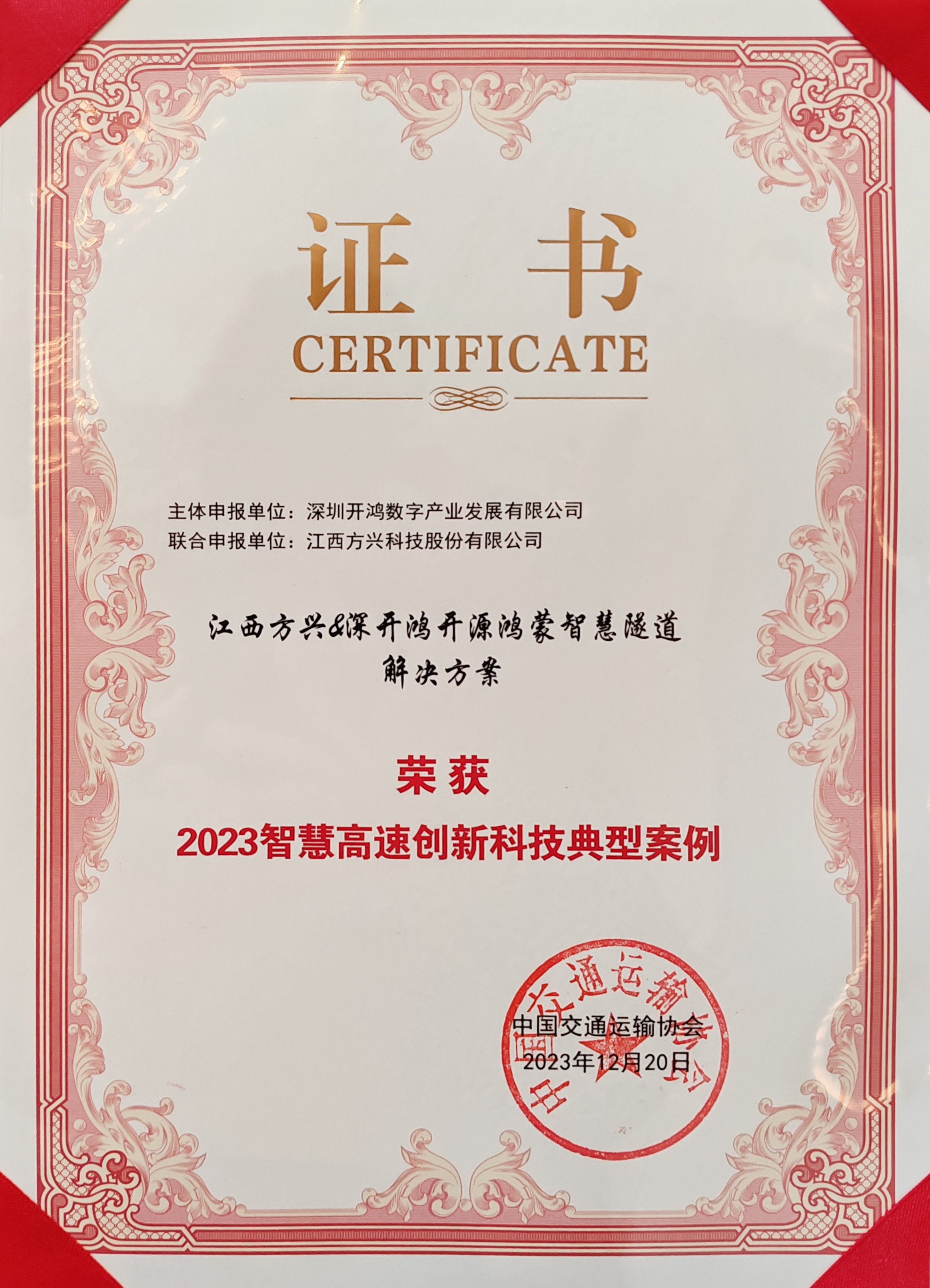 12月26日,在由中国交通运输协会、雄安新区建设和交通管理局主办的“2023 中国高速公路绿色智慧发展大会”上,深开鸿联合江西方兴科技股份有限公司(以下简称:方兴科技)打造的基于开源鸿蒙、全国产化自主可控的智慧隧道解决方案获颁“智慧高速创新科技典型案例”。这一荣誉体现了双方合作的创新成果,肯定了该方案在国内高速公路智能化领域的领先地位,对我国智慧高速公路的建设起到积极的示范作用。
