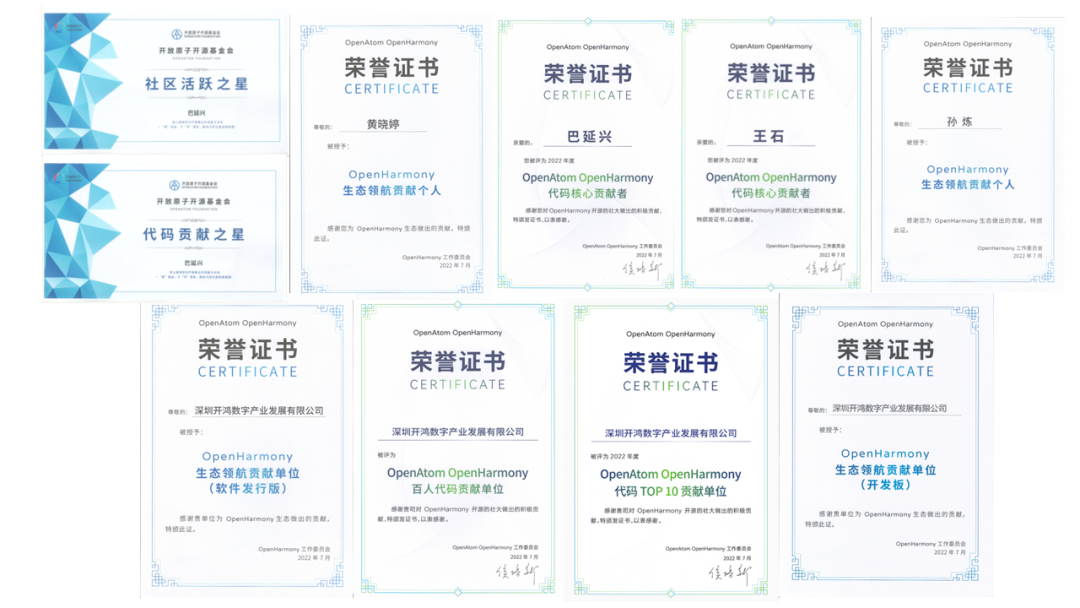 在27日的OpenAtom OpenHarmony分论坛上,为感谢助力OpenHarmony在各行业领域实现产品落地的优秀单位和个人代表,OpenHarmony生态委员特别举办了隆重的致谢授牌仪式。深开鸿凭借在OpenHarmony开源项目的研发投入、产品创新以及生态落地成果,被授予“2022年度OpenAtom OpenHarmony 代码Top10贡献单位”、“OpenAtom OpenHarmony百人代码贡献单位”、“OpenHarmony生态领航贡献单位(软件发行版)”、“OpenHarmony生态领航贡献单位(开发板)”、“2022年度代码贡献之星(巴延兴)”、“2022年度社区活跃之星(巴延兴)”、”“2022年度OpenAtom OpenHarmony代码核心贡献者(巴延兴、王石)”、“OpenHarmony生态领航贡献个人(黄晓婷、孙炼)等多项重量级奖项。这也意味着,中软国际和深开鸿正充分发挥着开源创新引领者的作用,全方位助力开源事业朝着高质量发展方向迈进。