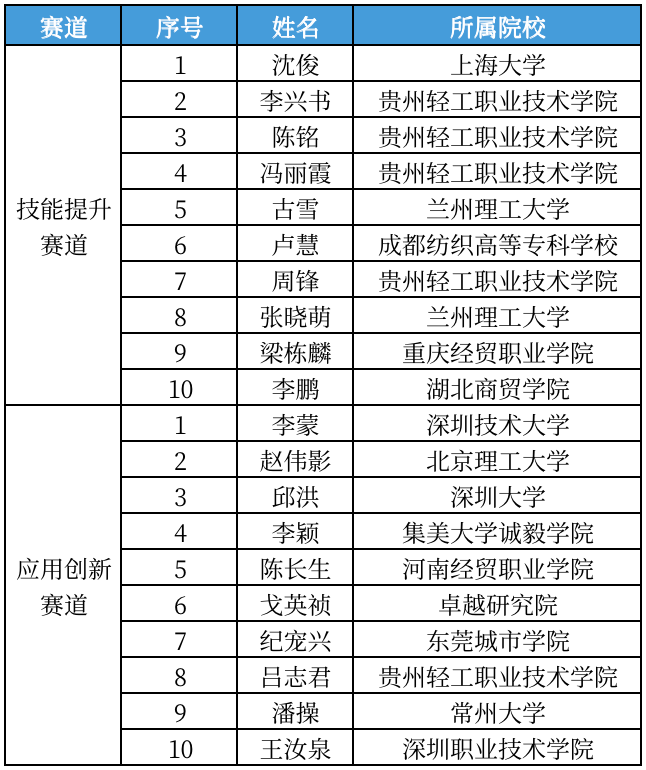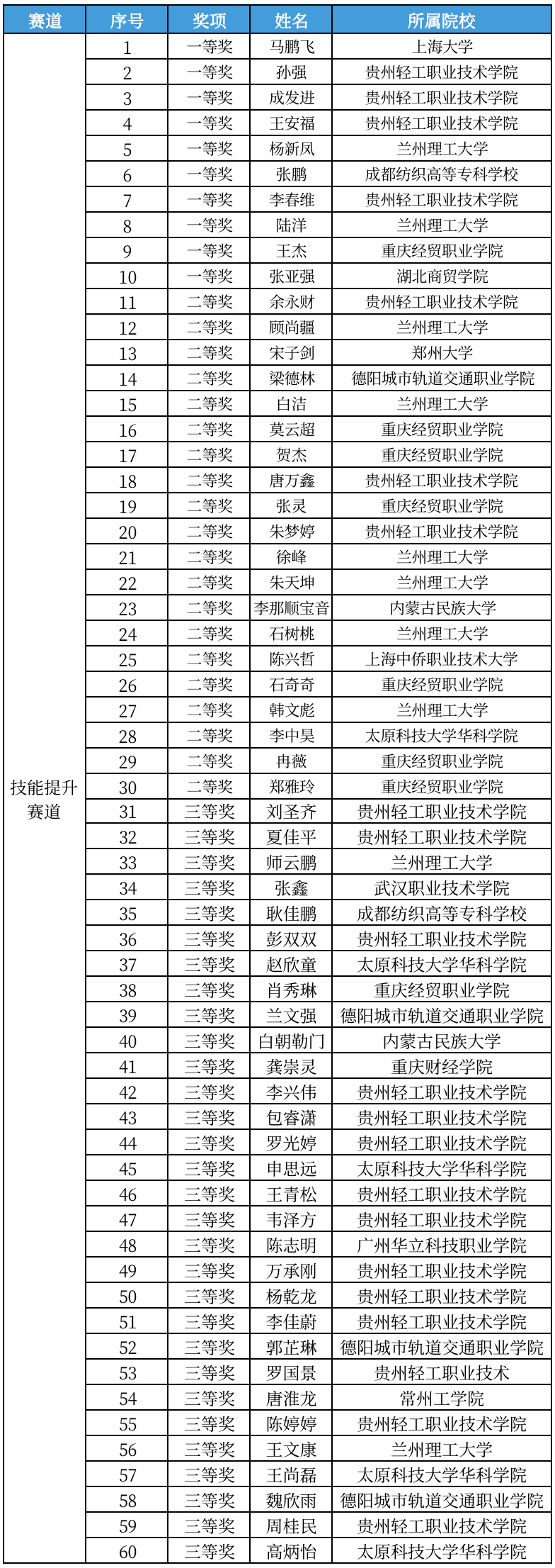 本次大赛经历了区域赛预选以及全国总决赛,最终两个赛道共有120支队伍获得荣誉。其中,技能提升赛道有60支队伍获奖,分别是一等奖10支,二等奖20支,三等奖30支,获奖名单如下: