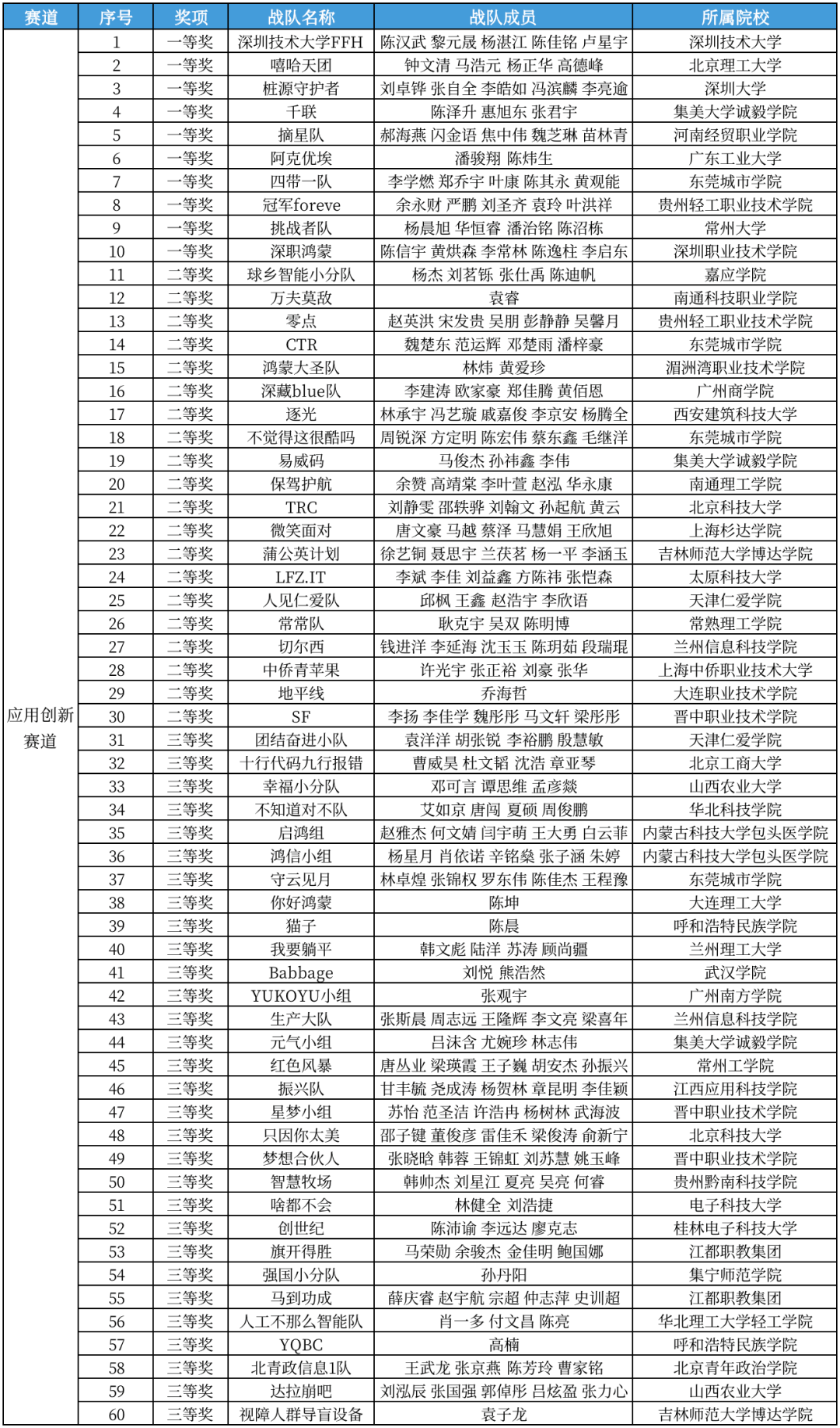 应用创新赛道有60支队伍获奖,分别是一等奖10支,二等奖20支,三等奖30支,获奖名单如下: