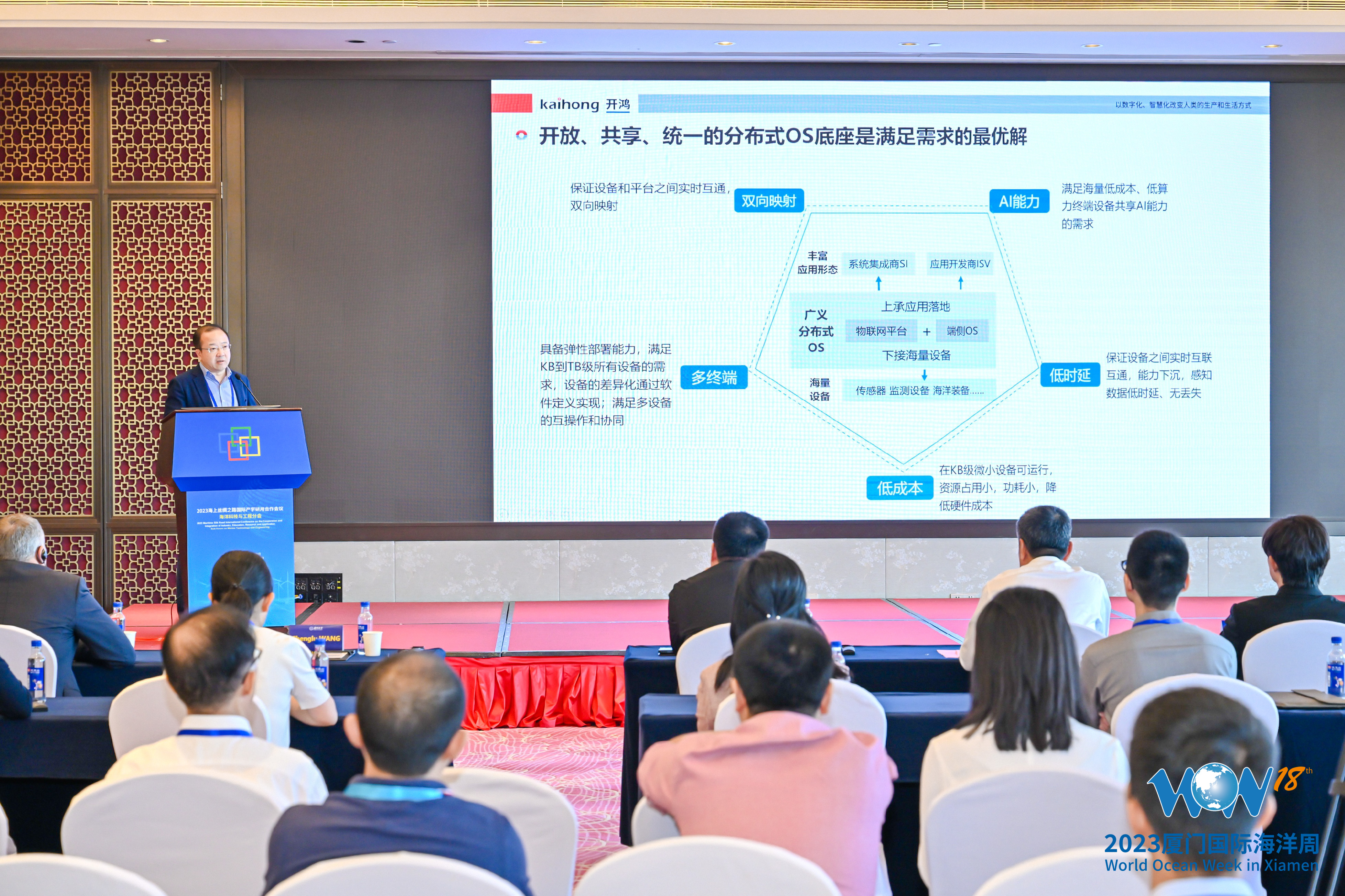 本次会议对于我国积极推进数字孪生海洋开发应用布局,实现数字孪生海洋创新技术的自立自强和国际引领,具有重大意义。会上,深开鸿CEO王成录受邀发表开幕致辞,同时分享了《开鸿安全数字底座,赋能海洋数字孪生未来》主题演讲,介绍了基于国产操作系统KaihongOS的开鸿安全数字底座赋能智慧海洋高质量发展路径。