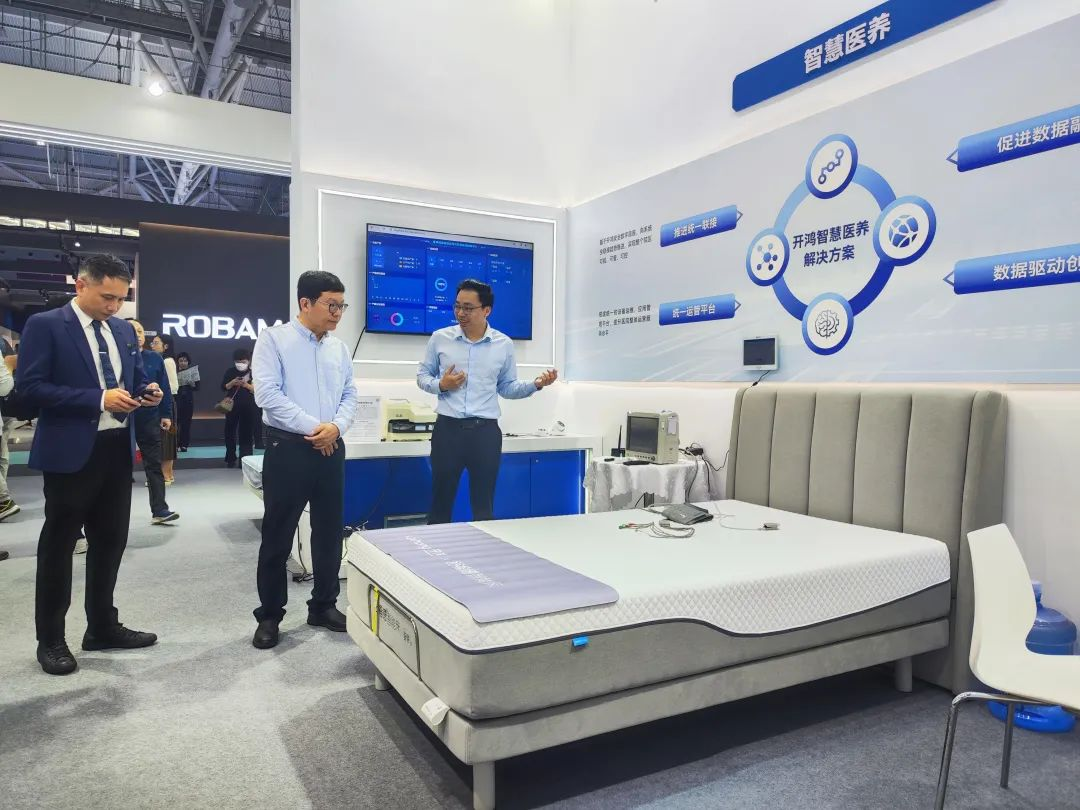 现场观众可以亲身体验智能床、智能沙发等设备,通过KaihongOS实现设备间数据融合,不仅可以无感采集人体体征数据,还能实时监测用户的睡眠状态、心率、呼吸频率等生理指标,助力智慧康养产业创新发展。