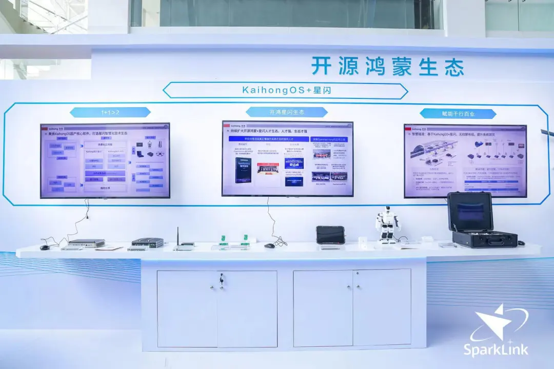 在开源鸿蒙生态展区,深开鸿带来了开鸿星闪控制器、开鸿星闪连接器等“开源鸿蒙+星闪”系列产品,并介绍了其在行业场景的智慧化应用,全方位展示了开源鸿蒙与星闪技术的深度融合与创新应用。