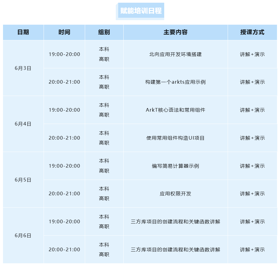针对第八届全国大学生网络与信息技术大赛开源鸿蒙原生应用大赛赛道,深开鸿联合大赛主办单位,面向所有参赛选手组织4期线上直播赋能,涵盖开源鸿蒙原生应用大赛竞赛所涉及的知识点,帮助选手全面提升竞赛能力。