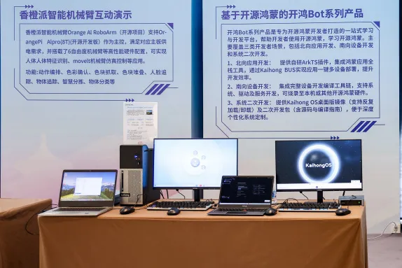 深开鸿在展区展示了开鸿Bot系列产品——开鸿BotBook、开鸿BotMini、开鸿BotStation。作为一站式开源鸿蒙学习与开发平台,开鸿Bot系列产品通过深开鸿自研的ArkTS Project Manager插件,深度集成了方舟脚本语言ArkTS和UI框架ArkUI,实现开发体验的无缝协作。该系列产品还提供丰富的教学内容、系统源码、开发工具链,成为机器人及泛IoT场景开发者的理想入门平台。现场有开发者表示:“以前开发需要两台设备、两套系统来回切换,不仅效率低下,还容易出错。现在一套系统、一台开鸿Bot就能搞定,效率提升太多了!”