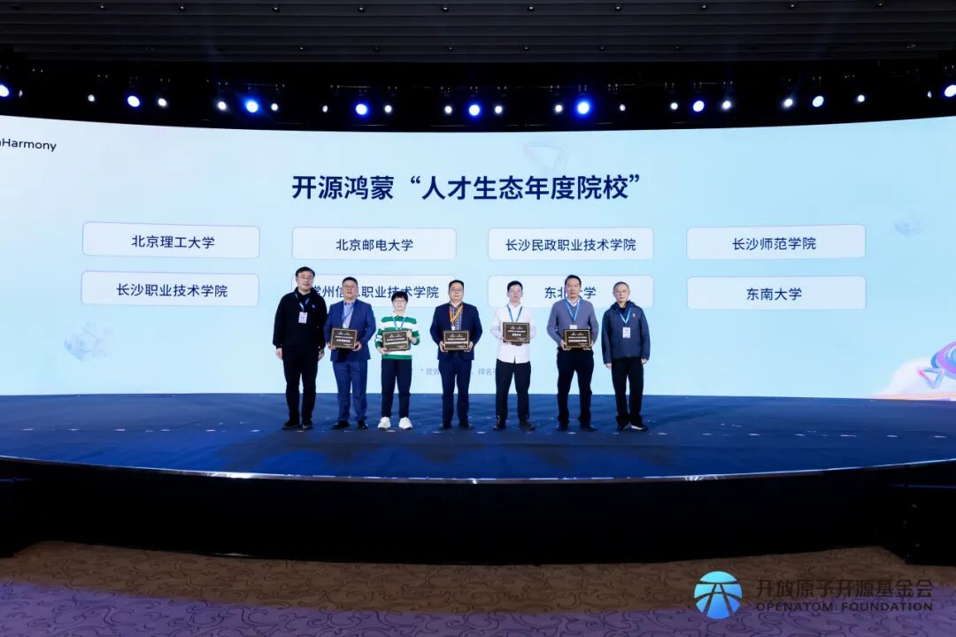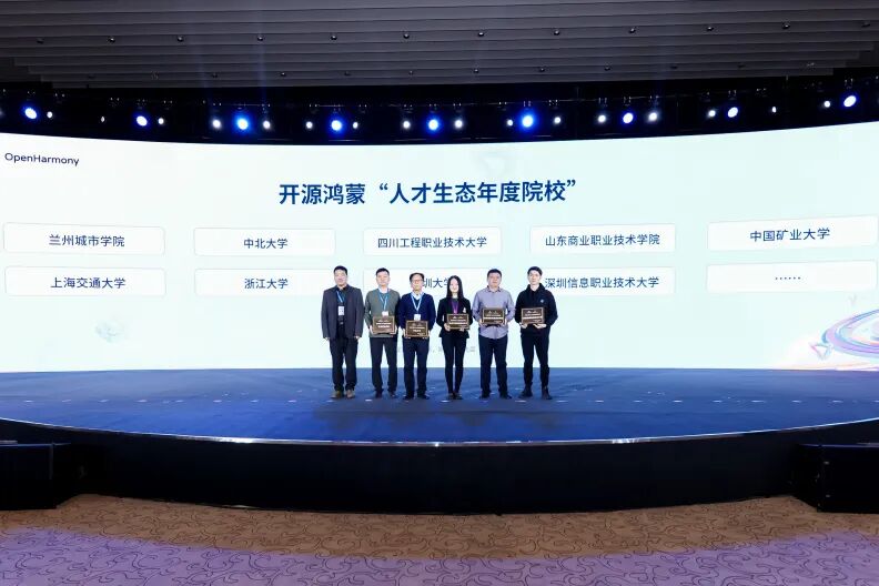 在大会的致谢环节,深开鸿的合作院校——北京理工大学、中国矿业大学、东南大学、华中科技大学、四川工程职业技术大学、广东理工职业学院、深圳信息职业技术大学、哈尔滨工业大学威海校区共同打造的教育领域案例获得开源鸿蒙“人才生态年度院校”授牌,1名社区贡献者获得“开发者π队年度同行者”授牌,体现了深开鸿在推动产教融合、推动社区建设方面的贡献。