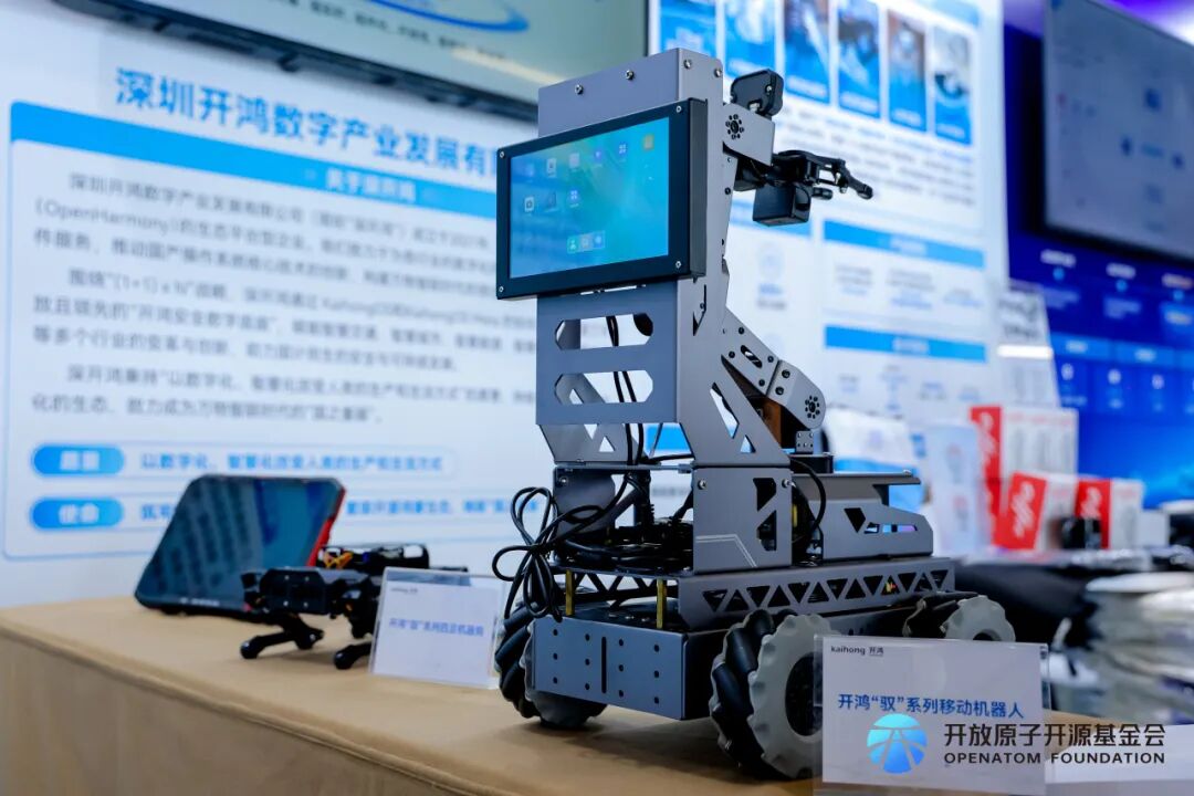 在互动展区,深开鸿带来了基于M-Robots OS的开鸿“驭”系列四足机器狗和移动机器人。观众通过平板、电脑即可指挥机器人完成动作,并实时获取机器人视角的画面。该产品支持开源鸿蒙及星闪的学习及开发,旨在解决“开发者上手开源鸿蒙机器人的第一公里难题”,提供典型案例与调试工具,开箱即用,是专为开源鸿蒙机器人开发者打造的实验与验证平台。