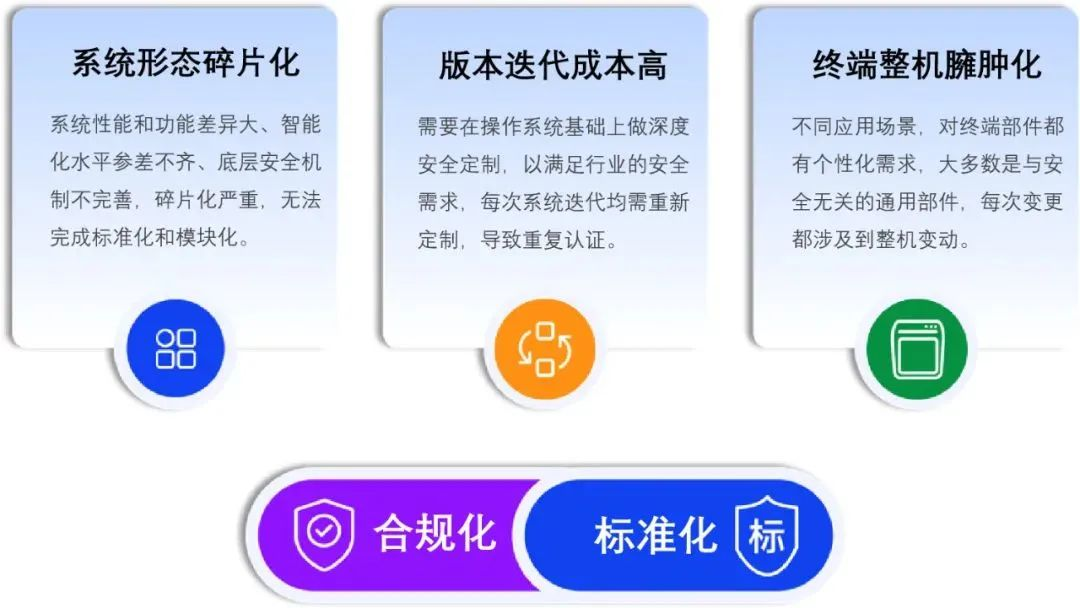 随着提交测评产品的品类增加,越来越多的生态厂商反馈基础的产品兼容性规范(简称“PCS”)和XTS兼容性测试套件(XTS兼容性测试套件是应用兼容性测试套、硬件抽象兼容性测试套、分布式兼容性测试套的合称,以下简称“XTS套件”)无法充分看护行业的生态兼容性诉求,如下图金融终端行业兼容性痛点。为满足生态伙伴的兼容性业务诉求,兼容性工作组规划与生态伙伴一起为各行业进行扩展PCS和XTS套件设计,用以支撑各行业产品差异化生态兼容性测试。