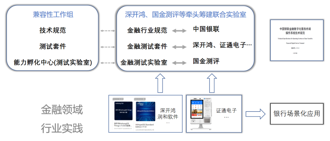 综合各行业特点和生态伙伴迫切的业务诉求,兼容性工作组从金融行业开始,大力推动行业兼容性标准落地,并由深圳国家金融科技测评中心(简称“国金测评”)主导扩展兼容性规范设计。在银联、深开鸿、证通电子、润和软件等多家头部企业专家的积极参与下,共同完成行业扩展兼容性测评方案设计,并输出《金融数字化服务终端产品兼容性规范》。在通过兼容性工作组、兼容性SIG等多轮生态技术评审后,于2022年8月10日正式发布到OpenHarmony社区。