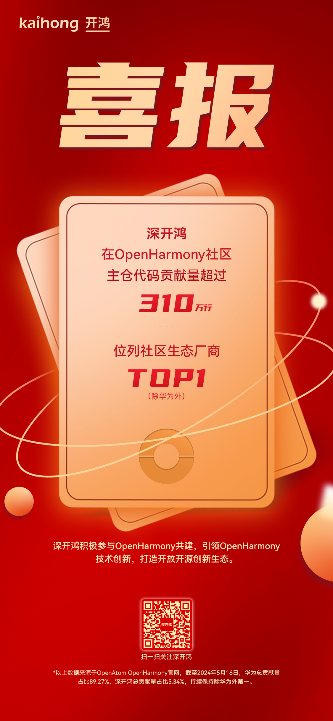 喜报! 深开鸿在OpenHarmony社区 主仓代码贡献量超过310万行 位列社区生态厂商TOP1 (除华为外第一) 深开鸿积极参与OpenHarmony共建 引领OpenHarmony技术创新 打造开放开源创新生态!
