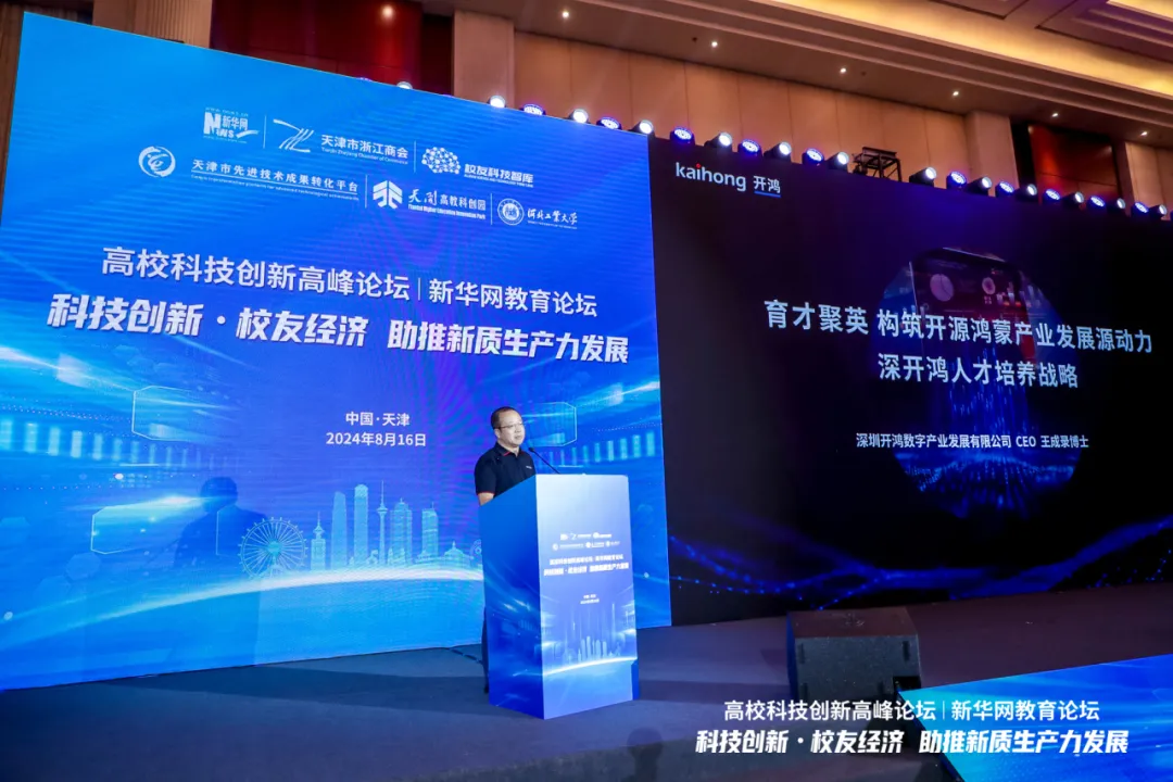 深开鸿CEO王成录博士作为特邀嘉宾,发表了《育才聚英,构筑开源鸿蒙产业发展源动力——深开鸿人才培养战略》的主旨演讲。他指出,当前,开源鸿蒙生态已成为最具生命力的数字生态,生态的发展需要多元化的人才支持,面对开源鸿蒙产业的快速发展,构建系统化、全面化的人才培养体系成为当务之急。