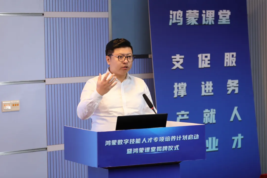 在揭牌仪式上,深开鸿教育系统部解决方案总监于辰光也进行了精彩的分享。他详细介绍了深开鸿在开源鸿蒙领域的技术创新突破,以及公司在推动开源鸿蒙人才培养方面所取得的显著成果。于辰光指出:“深开鸿凭借深厚的技术积累和丰富的行业经验,已经成功打造了一系列基于开源鸿蒙的创新解决方案。我们将这些解决方案与本次培养计划紧密结合,为学员提供前沿的技术培训和实战机会,帮助他们快速掌握开源鸿蒙操作系统的核心技术和应用能力。”